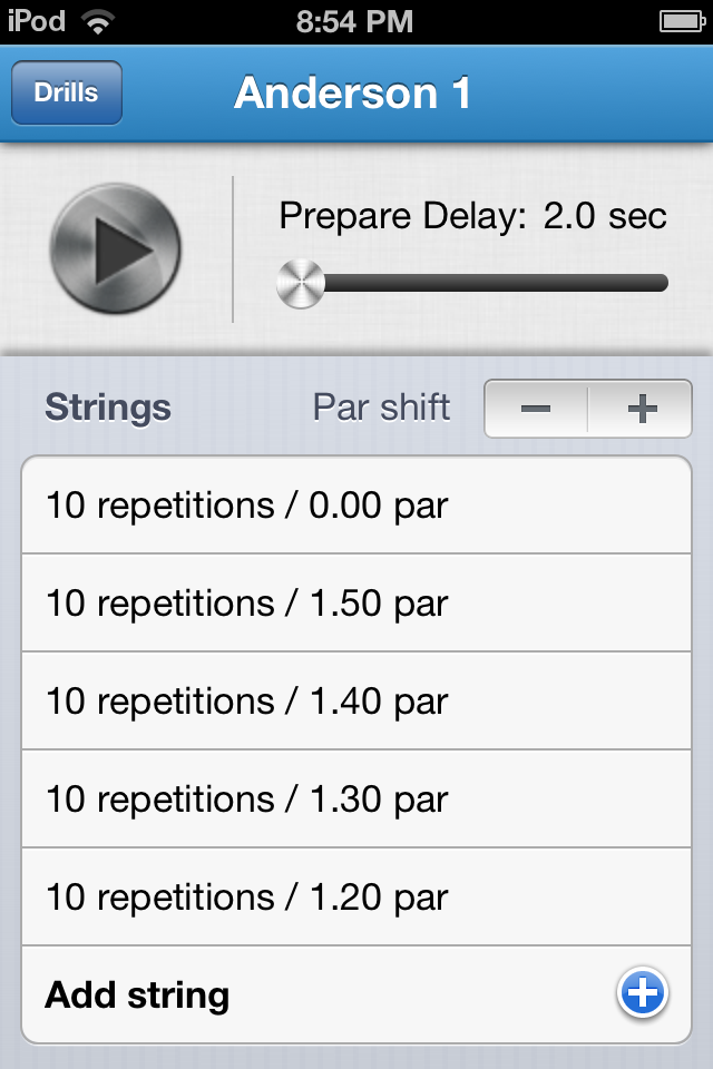 Once you have the strings entered in the drill, changing the par times on all of the strings is just a click away by using the “Par Shift” buttons. Each click changes the par by 1/20th of a second, so as you progress in your training, you don’t have to edit each string individually.